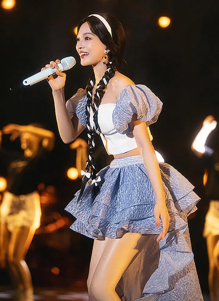 另一身仙气十足的造型,来自中国设计师品牌Susan Fang。设计师从中央圣马丁毕业后,先后在Celine、Stella McCartney和Kei Kagami实习和工作,并于2017年创立该同名品牌。可记得Jisoo 《Flower》MV里那身浪漫花卉裙?也是来自Susan Fang。其服装不仅受到女星青睐,男星华晨宇演唱会的花卉装同样由Susan Fang打造。