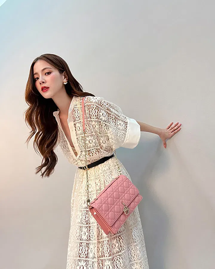 洞眼或蕾丝设计裙装,绝对是又纯又欲的优雅典范。这类服装在Dior的2024早春系列中屡见不鲜。Baifern搭配的这款粉色手袋,则是当下中韩泰星及时尚人都在背的MISS DIOR。
