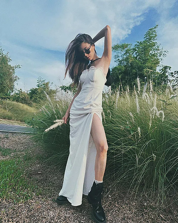 永远玩不腻的“下半身失踪”造型,想要增添更多风格趣味。学Baifern在大腿上系一个蝴蝶结,和Jennie在手腕上系蝴蝶结有异曲同工之妙——请见:Jennie的烈焰全红造型中《You & Me》的穿搭方式。