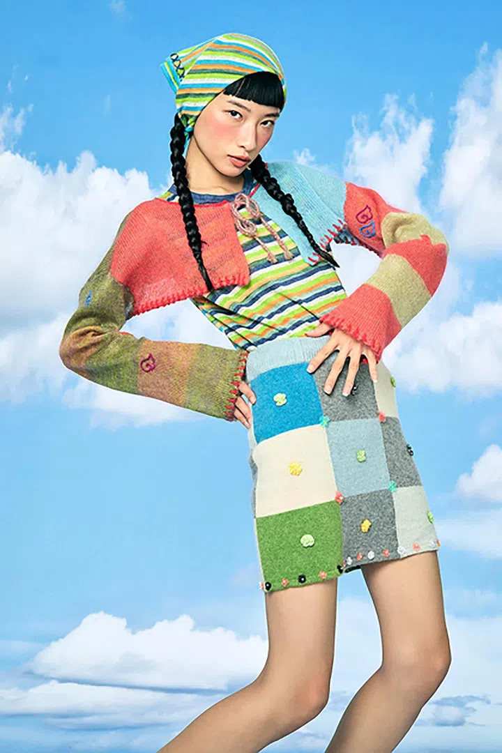 YanYan在广东话里有“人人”的意思。倒过来看,“人人”就像“YY” ,是不是颇有趣?设计师也将品牌符号嵌入各种服饰。例如由不同颜色布料拼接而成的外套,每一朵小花下都绣有“YY”的符号,宛如花茎。俏皮可爱的设计,很眼前一亮。