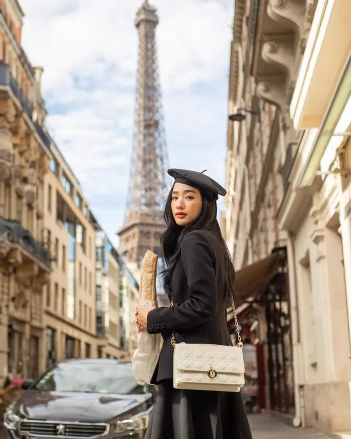 泰国女星Kimberley Anne Woltemas,也是Dior的品牌大使。2023年9月她与Mark Phin在意大利举办婚礼, 其婚纱还是Maria Grazia Chiuri特为定制。上图她手握Miss Dior,展现了手袋的不同携带方式。