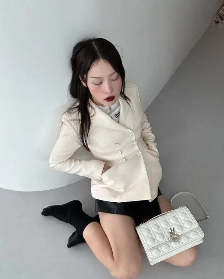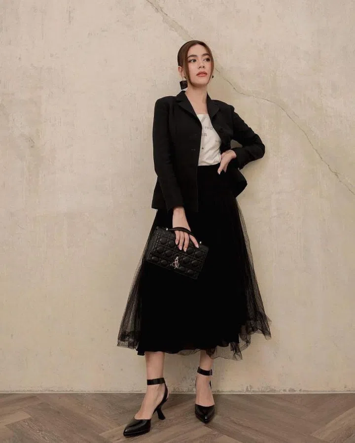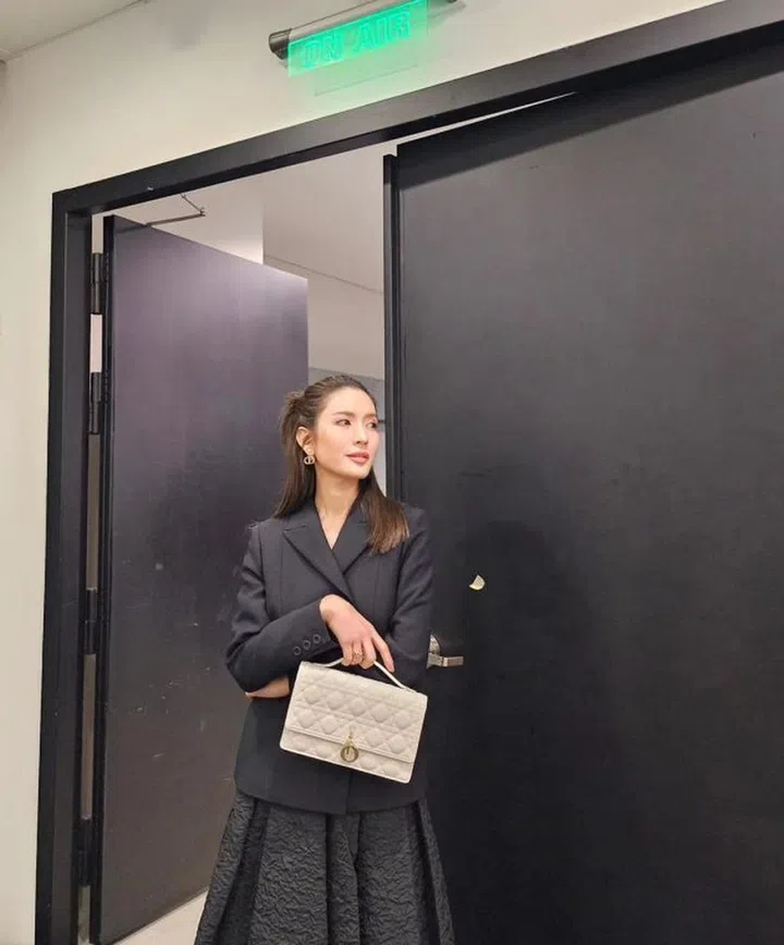 这款精致的Miss Dior手袋,内部设有两个间隔,方便收纳和取放物件,格调优雅又兼具实用功能。泰国女星Aff用白色款搭配黑色套装,手袋上的金属硬饰还和耳坠巧妙呼应。