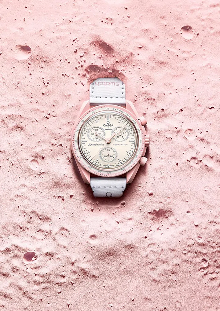 该BIOCERAMIC MoonSwatch系列包含11款手表(表径42mm),分别以11 个行星体为腕表命名(包含太阳系中心的行星到其外围的矮行星),并以不同设计将星体一一展现。比如上方这款粉色元素腕表,就是献给金星这颗爱神星球。