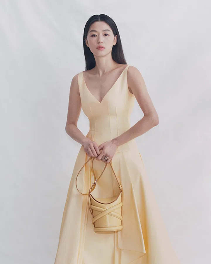 身为Alexander McQueen品牌大使的全智贤,早前为品牌拍摄了春夏系列lookbook。其中一张照片里,她以一袭柔和的浅黄色连衣裙登场,搭配Curve包,完美演绎tone-on-tone时尚穿搭法。