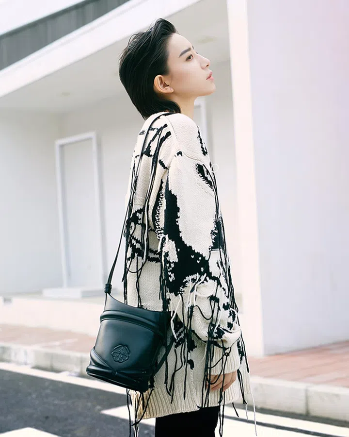 出演《乘风破浪》爆红的李斯丹妮,身穿Alexander McQueen“脱线”针织毛衣,再搭配黑色皮革的Curve包,帅爆!