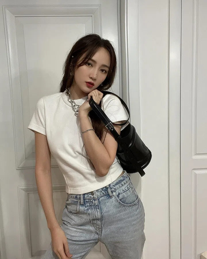 另一位“浪姐”孟佳则以简单的白T恤及牛仔裤搭配同款Curve包,穿出休闲的街头个性。