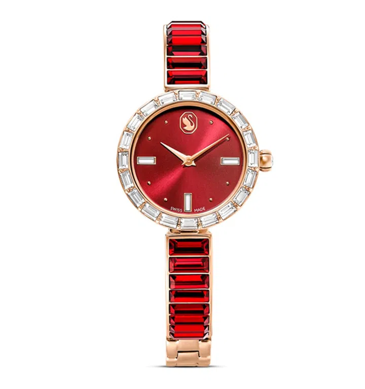 想寻找一款特别的首饰?可以考虑Swarovski的红色Matrix Bangle腕表。玫瑰金表壳搭配镶有20颗透明水晶的表圈,以及点缀着16颗鲜艳红色水晶的表带,完美融合了活力与精致。