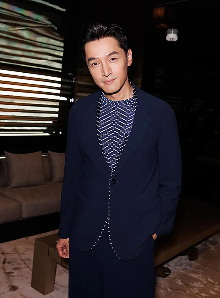 胡歌穿着Giorgio Armani 2023年春夏系列设计出席鸡尾酒会,相对另一套正装更加休闲、随性。