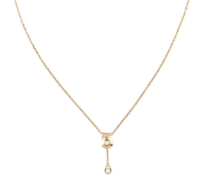 这款项链以镜面抛光设计打造数字“5”项坠,使中央主钻更为突出。下方的水滴形镶钻挂坠,则为整体设计增添了一抹优雅。这款项链不仅适合日常佩戴,更能在特殊场合下展现出一种柔和又高贵的千金气质。