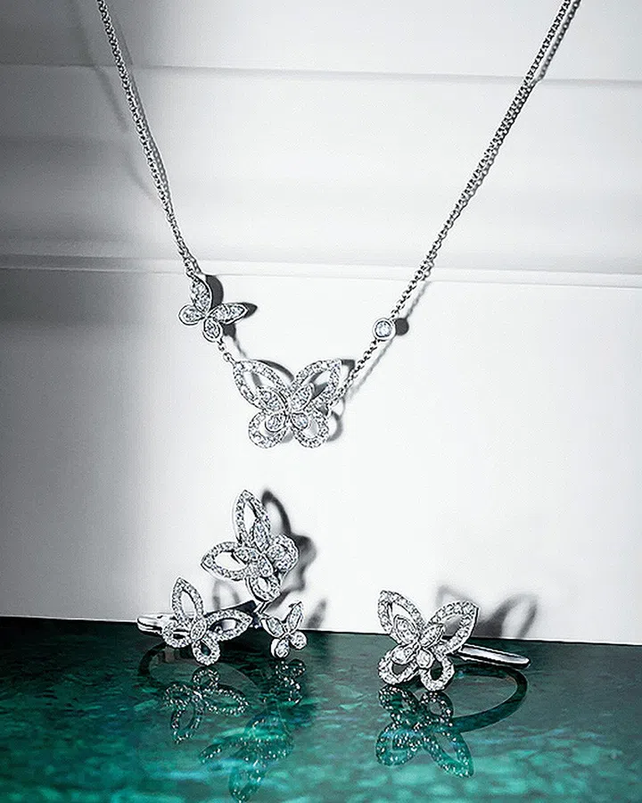 GRAFF Double Butterfly Silhouette 镶钻白金项链 $10,500、 Triple Butterfly Silhouette 镶钻白金指间戒 $12,000、 Butterfly Silhouette 镶钻白金戒指 $9,900起