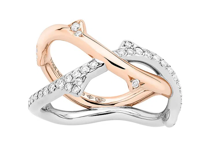 玫瑰金与白金的混搭已成为现代首饰的热门趋势。这款戒指巧妙地结合了两种贵金属,使外观更加耀眼夺目。如果玫瑰金和白金你都难以取舍,不妨选择这款“二合一”的设计。