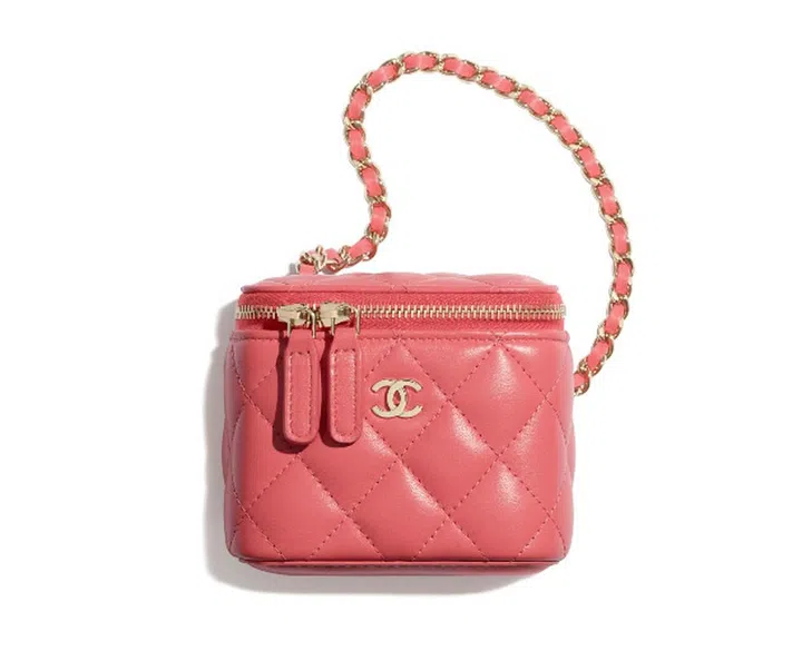 Chanel的经典链条化妆箱手袋,以小羊皮材质制作袋身,表面缝有品牌代表性的CC标志,珊瑚红色则为造型添加俏丽活泼的气息。