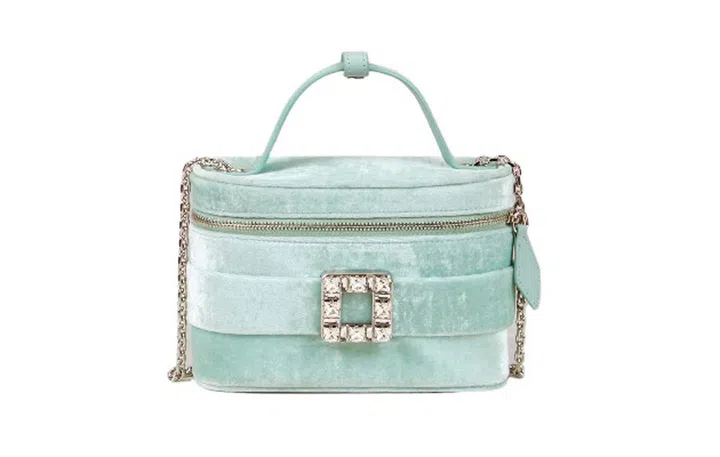 Roger Vivier的这款迷你化妆箱手袋,以雅致的天鹅绒手工制成,配以闪钻饰扣,拎在手腕上宛如珠宝般闪耀,无论出席夜宴或约会,都能为造型注入一份精致美感。