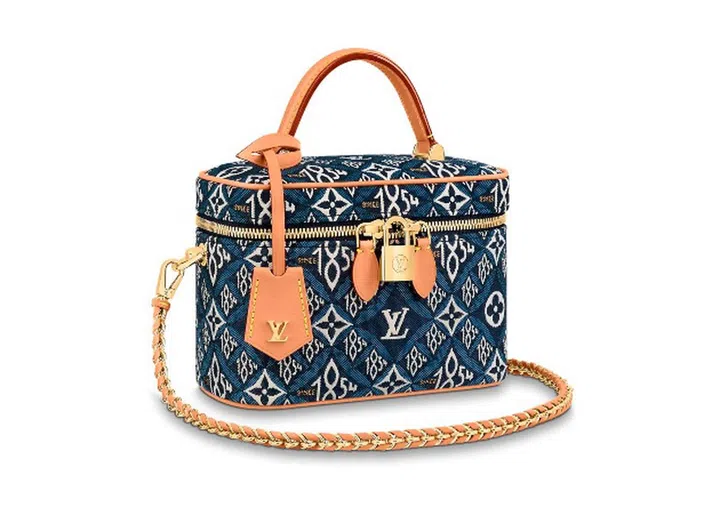2021春季新款Vanity小号化妆箱手袋,采用Since 1854 提花织物和做旧天然皮革饰边制作,展现品牌创始年份1854和Monogram花卉的融合。此外,编织皮革链条还可以随心拆卸,手袋佩戴方法多样化,可手拎、肩背或斜挎。