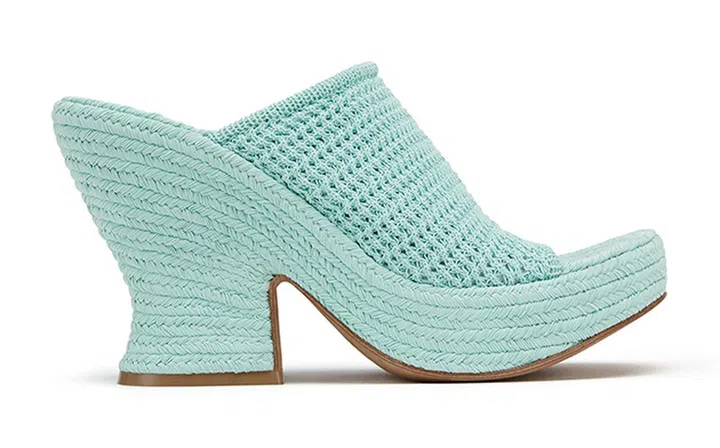 Bottega Veneta今季打造了一系列材质丰富、配色清新的platform wedge,该款式采用软胶触感的皮革;整个鞋款的造型看起来厚重,其实穿着起来比你想象的轻盈。
