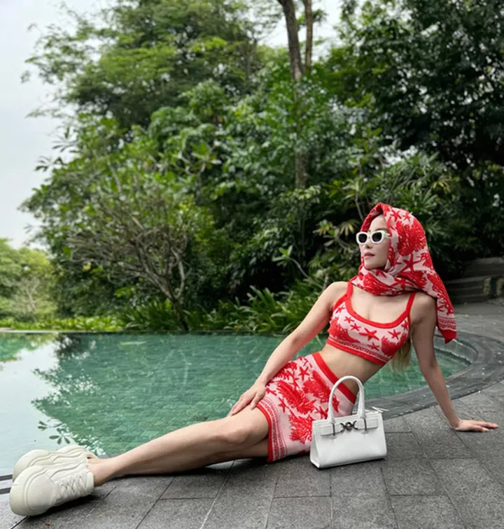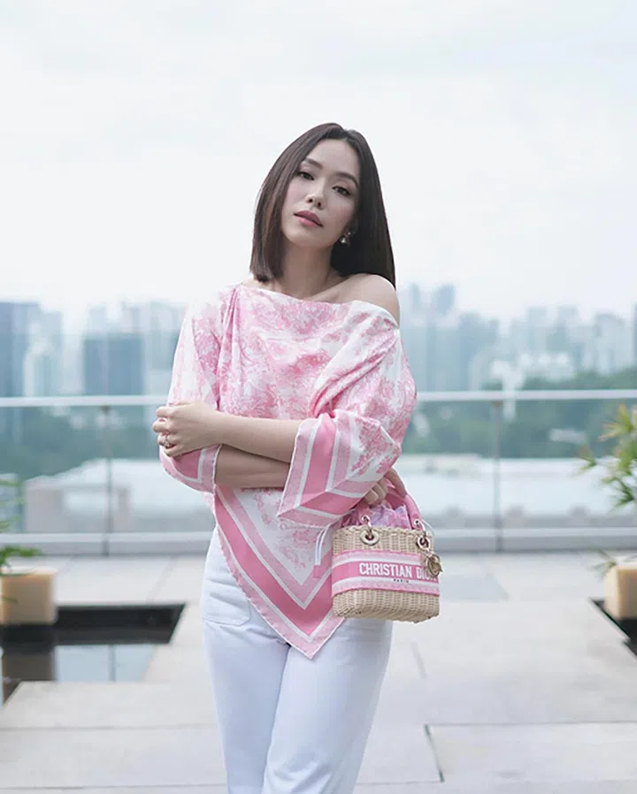 林慧玲穿着Dior的Dioriviera胶囊系列Toile de Jouy Sauvage露肩丝巾上衣造型搭配同样糖果粉调的Dioriviera Lady Dior迷你藤编手袋,风格清新优雅,尤其适合度假及周末装扮。