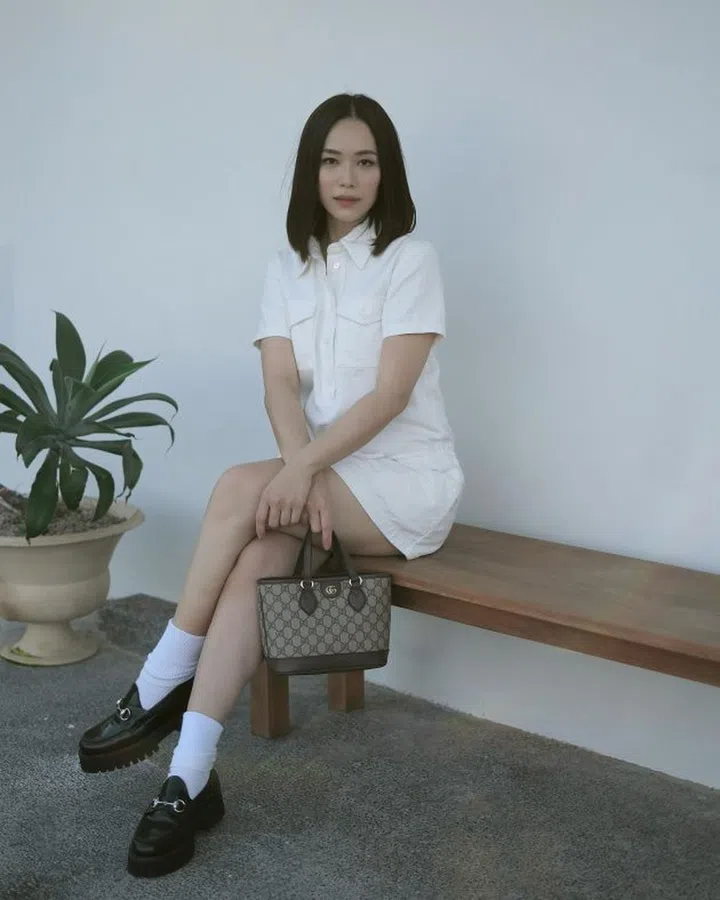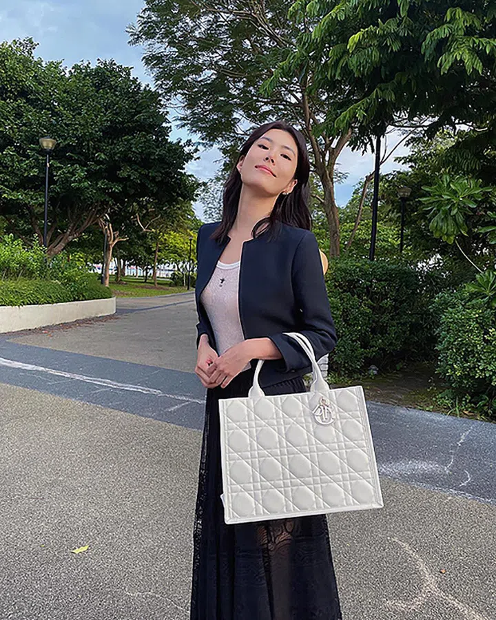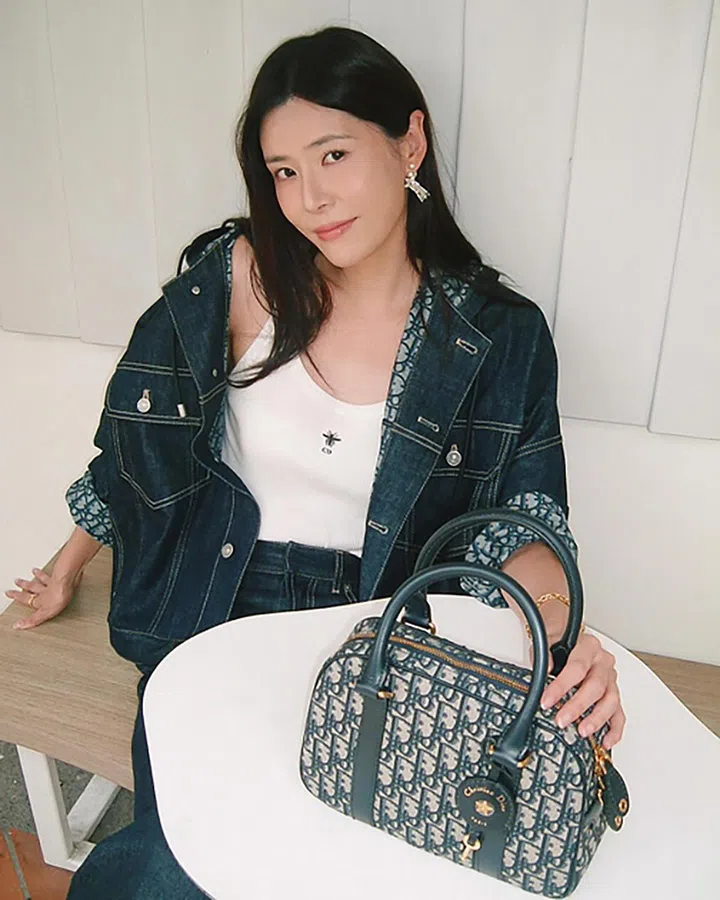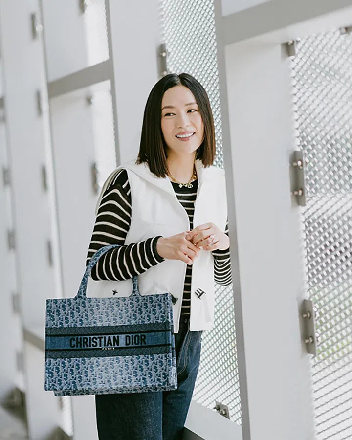 私下常常背Dior Book tote出门的林慧玲,相信也是看中了这款手袋经典、休闲又“好装”的优点。上图这款装饰蓝色denim Dior Oblique提花的Book tote,袋身采用不规则石洗效果,风格松弛又随性。同时,手袋也和她裤脚及Walk’n’Dior球鞋上的Dior Oblique图案相呼应——这种时装+手袋/时装+鞋履/手袋+鞋履的“同款”穿搭方式,今年特别流行。