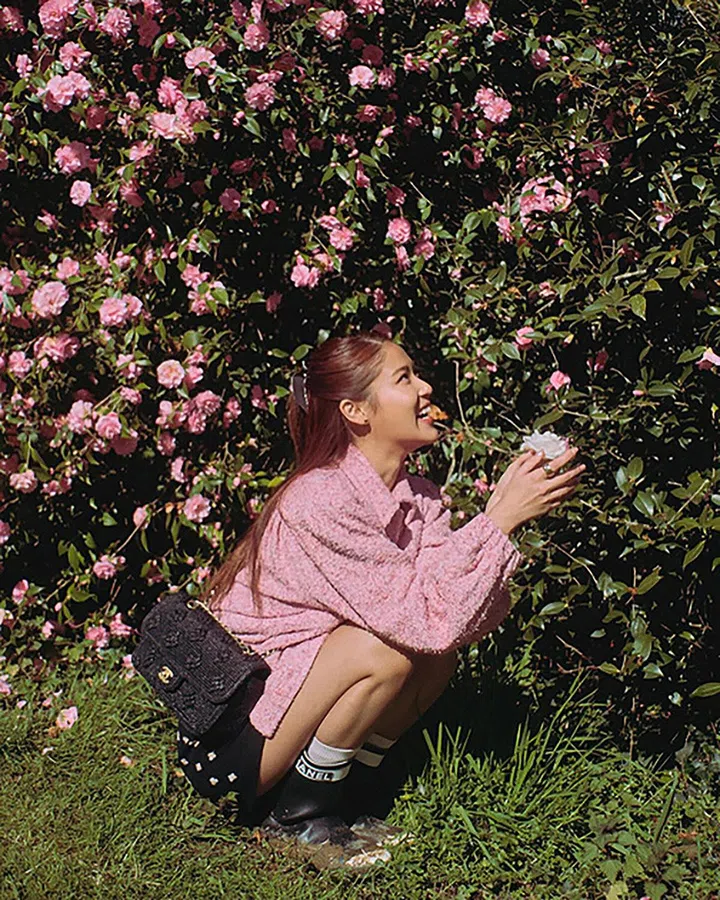 陈一心受Chanel Beauty邀请前往法国参观品牌的Gaujacq Open Sky Laboratory——坐标地点La Ferme aux Camélias de CHANEL,即Chanel位于法国西南部小镇Gaujacq的露天实验室,专门探索与研究世界各地的众多品种山茶花。陈一心穿着粉色花呢上衣,在粉色调的背景前受捧白色山茶花,并搭配了拉菲草效果编织Flap bag。