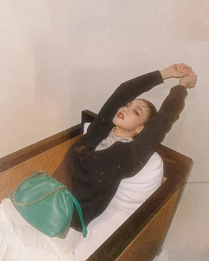 Versace今季主打袋款Medusa 95,拥有纤长的“东西”比例和建筑感轮廓,袋身上的Medusa 95硬饰是对Versace 1995 春夏系列标志性金属细节的全新演绎。谢宛谕用它搭配带海星、珊瑚、贝壳的Barocco Sea图案针织套装,展现夏日度假风情。