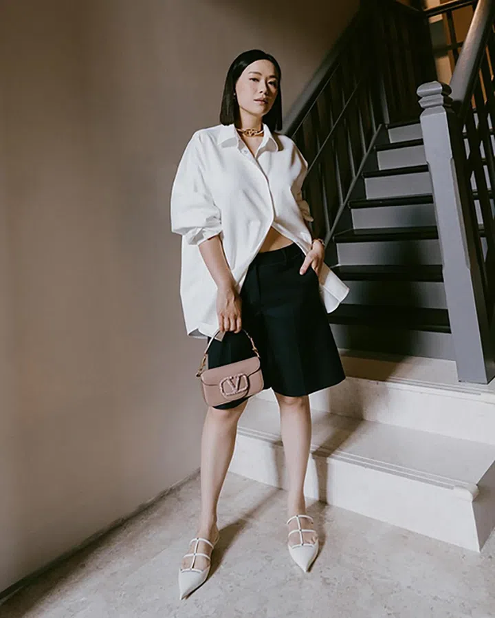 林慧玲也在IG展示Valentino造型及品牌各式各样的Locò手袋,黑白穿搭简约、现代,还自信“炫腹”——看来她产后真的恢复得很不错哦!她脚下的这款白色尖头Rockstud Wispy平底穆勒鞋,则为整体中性风造型注入了一丝精致女性美。