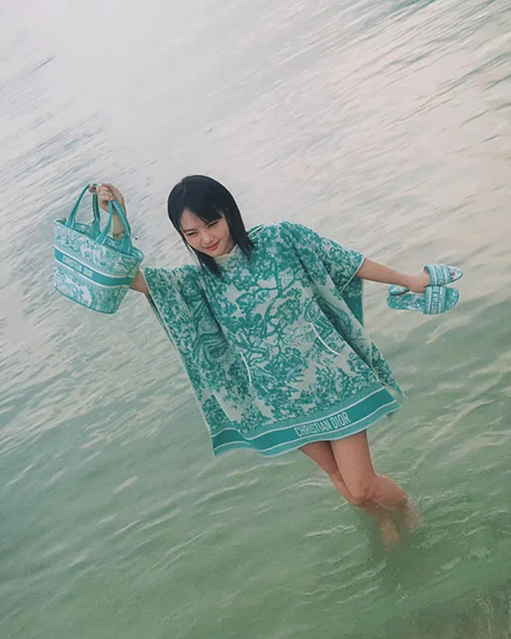 黄暄婷的Dior Dioriviera造型则选择了格外疗愈的Aquamarina色调,搭配Dioriviera Hat Basket Bag以及Dway Slide,打造舒适随性的海滩look。