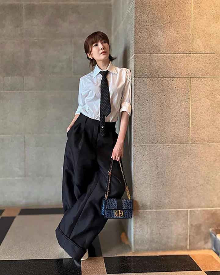 来自Dior的30 Montaigne East-West链袋,以蓝色denim Dior Oblique提花及不规则石洗效果打造出休闲随性的时尚风格。欧萱用它搭配帅气领带造型,展现干练现代的都市气质。