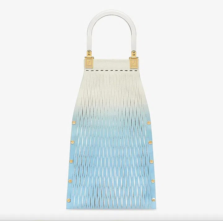 今季Fendi秀场上有许多有趣袋款:针织袋、编织袋、镂空手袋、“菜篮”袋、水壶袋,还有模特手里这款渐变色的皮革网袋尤其吸睛。