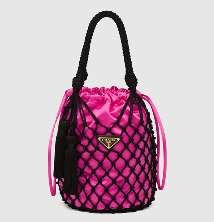 想要一款奢华版网袋?这款Prada的渔网袋采用了可拆卸的缎质内袋,结合编织网,并以黑色和亮粉色做色彩对比,造型格外醒目。