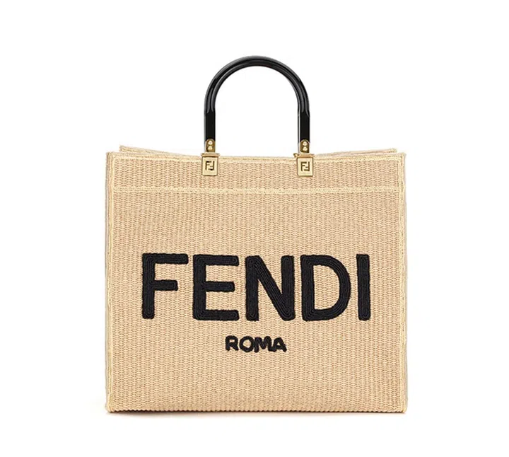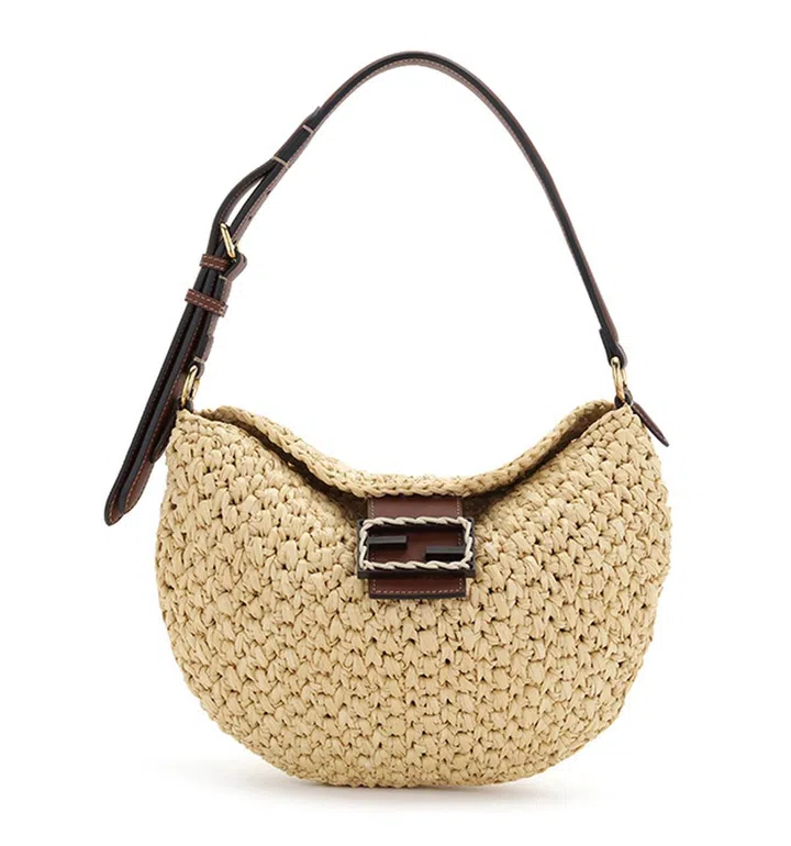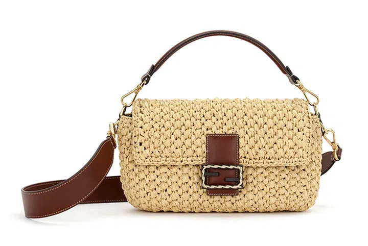 以天然色调的草编设计搭配深棕色皮革及FF包扣及金色硬饰,使经典Baguette手袋显得既放松又入时。