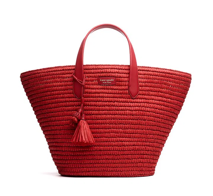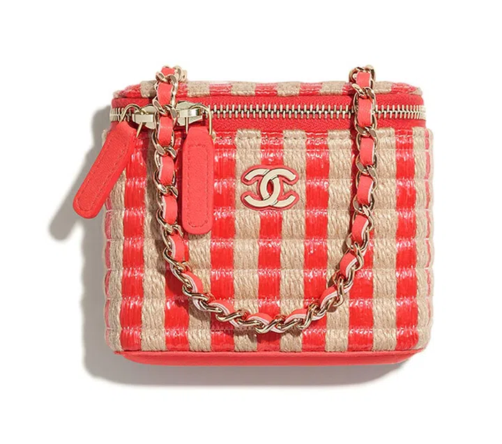 这款以拉菲草打造的vanity bag,装饰红色皮革及图案,造型灵巧轻便,打开后空间却不小,还设有帮你固定唇膏的收纳位。