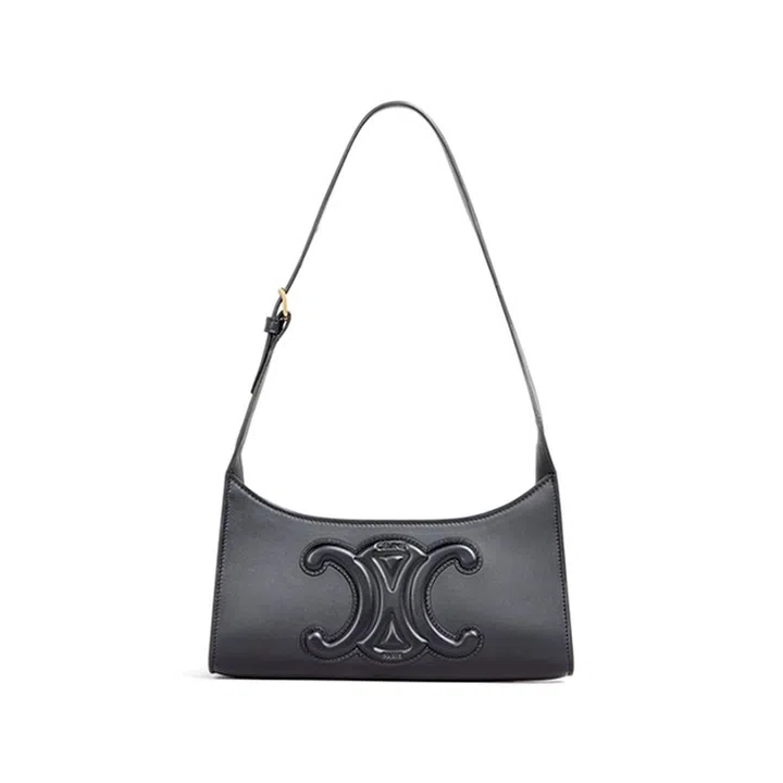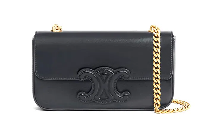 造型扁平、皮质柔软的黑色肩袋,包带可调节长度,轮廓也是当下正夯的“East-west”手袋。袋身上超醒目的立体Triomphe标记,为现代感手袋注入一丝复古气质。