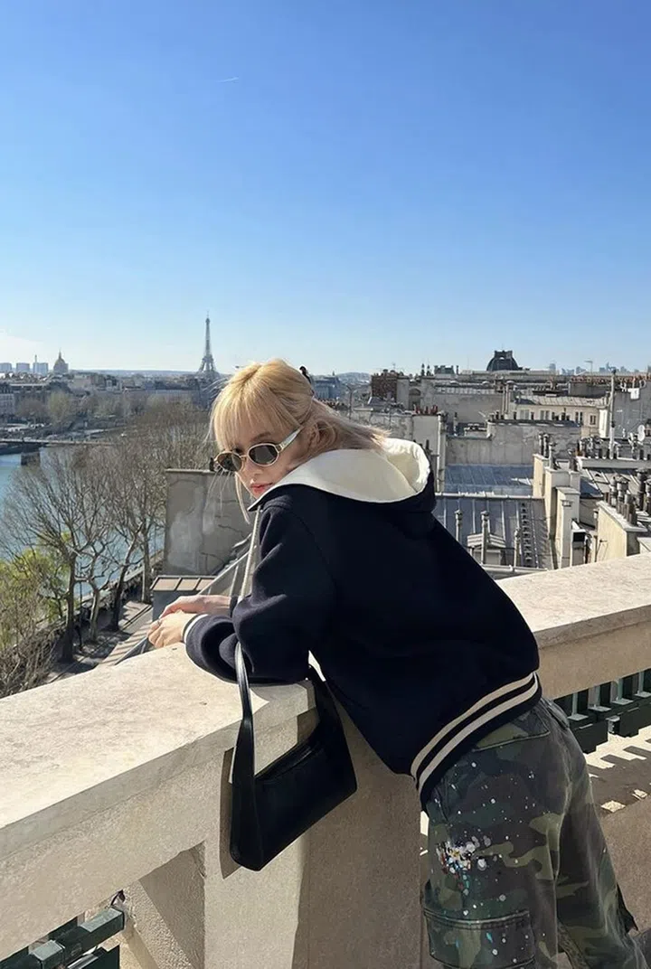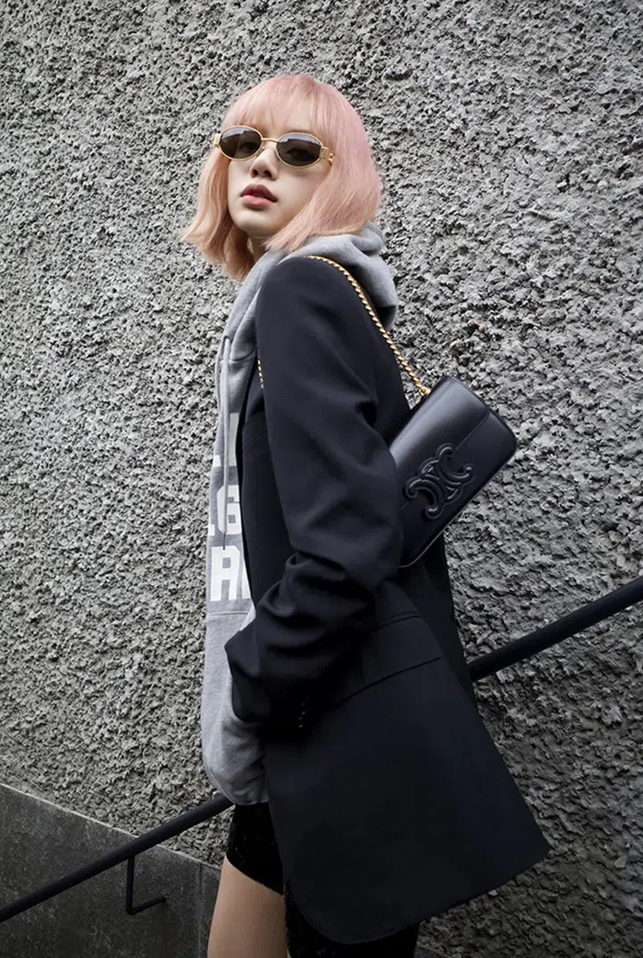 Lisa以Celine Teddy外套搭配品牌的金属墨镜,下装穿着迷彩长裤。造型虽然运动感十足,却携带了一款造型优雅的Triomphe手袋,可见这款手袋在日常生活中的灵活度。