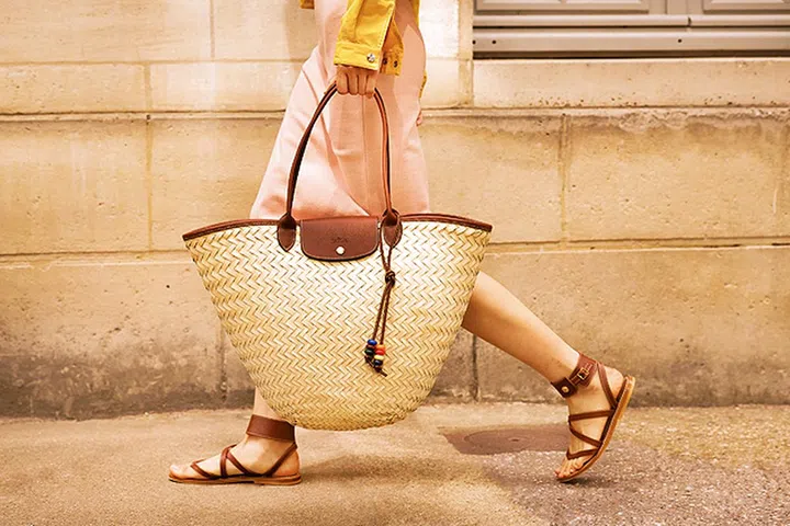 棕榈草编提袋,细节处结合皮革材质,并带有品牌的标志性开合设计,周末出街,度假出国都很好背。