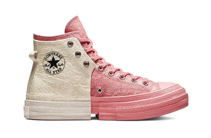 Converse与设计师Feng Chen Wang合作推出联名款球鞋,融入设计师标志性的解构再造元素,呈现二合为一的结拼球鞋设计,仙女系的粉红白组合,甜美中不失个性。