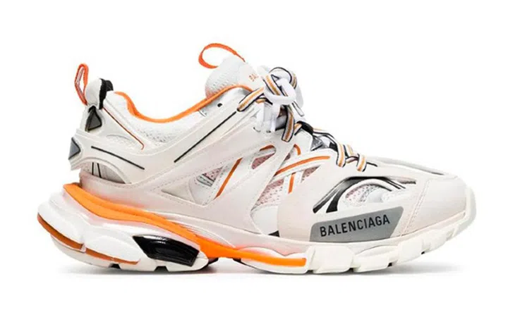 Balenciaga的网红爆款老爹鞋,鞋型霸气,底盘超稳,色彩对比鲜明的白橙黑配色,尽显活力潮气,为日常造型注入抢眼的个性态度。