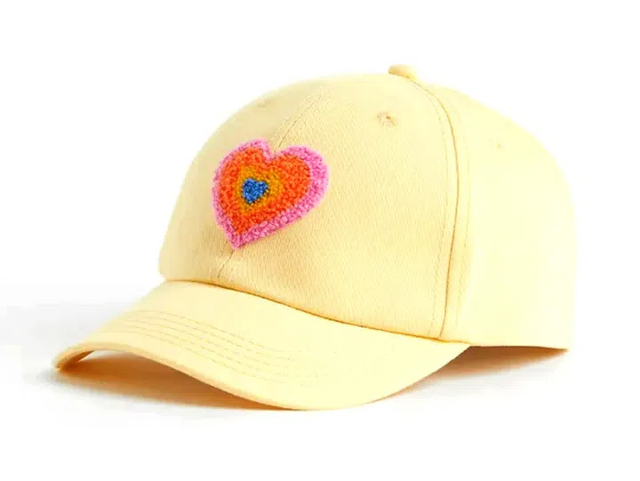 可爱的彩色心形刺绣,搭配积极阳光黄色,戴上后好心情满分!