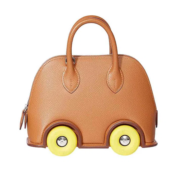 爱收藏包包的你,看准这款造型俏皮的Hermes手袋。迷你袋型装饰黄色滚轮,配备一条包带可供斜挎,不使用时摆在架上犹如玩具或艺术品般养眼。