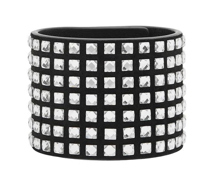 风格炫酷的黑色麂皮手镯,装饰风格现代的方形水晶缀饰,跨年时搭配金属色迷你连衣裙,或者穿上超辣的派对装去clubbing。