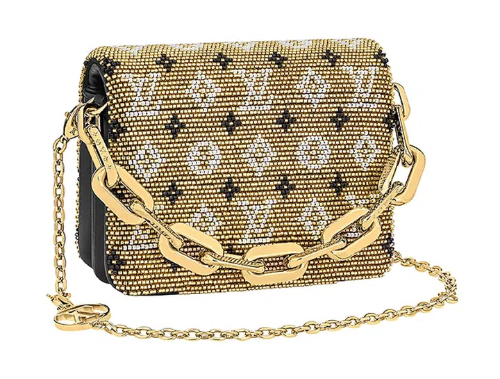 年尾想要犒赏自己一款包包?这款在LV 2023早春秀上亮相的Monogram珠饰金色Coussin腰袋,配备可拆卸链条,系在腰间也可手拎,造型方式灵活多变。