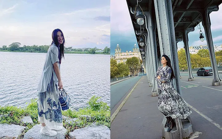穿上印花长裙的Rebecca,即使单看照片都感觉仙气飘飘。她在不久前为《女友》拍摄腕表大片,当天抵达时所穿的私服就是印花长裙+外套的造型,还提了一款Dior Book tote。只能说,整个人简直亮眼又养眼!