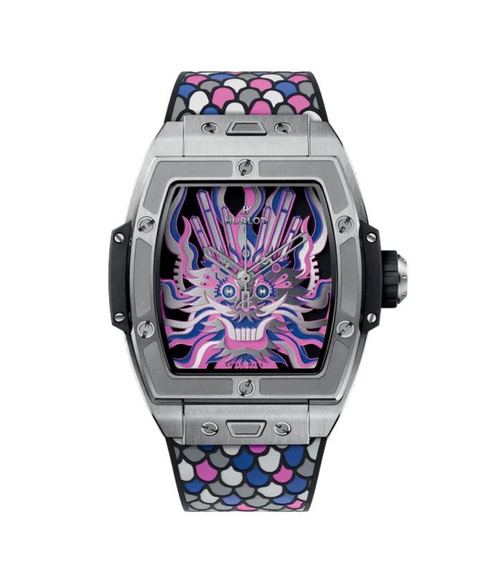 Hublot为农历新年打造一款Spirit of Big Bang钛金龙年限量款,融入源自中国剪纸艺术的灵感以及烘托古代帝王身份的紫色系。品牌从历史文献中寻找有关龙的型态与特徵,最终发现这种传说中的神兽经过数千年流传、演变,至少汇聚了九种现实动物的局部身体构造,包括虾眼、鹿角、牛嘴、狗鼻、鯰鬚、狮鬃、蛇尾、鱼鳞和鹰爪等等,因此腕表的面盘图案就是依照这些特点集合建构出的龙头。品牌还创新地将龙的“鱼鳞”特征融入表带装饰,采用染色和奈米硫化工序处理龙鳞零件,手工镶嵌在橡胶表带上——制作这样一条Spirit of Big Bang钛金龙年限量版的表带耗时超过8小时,堪称最费工的生肖表带之一。