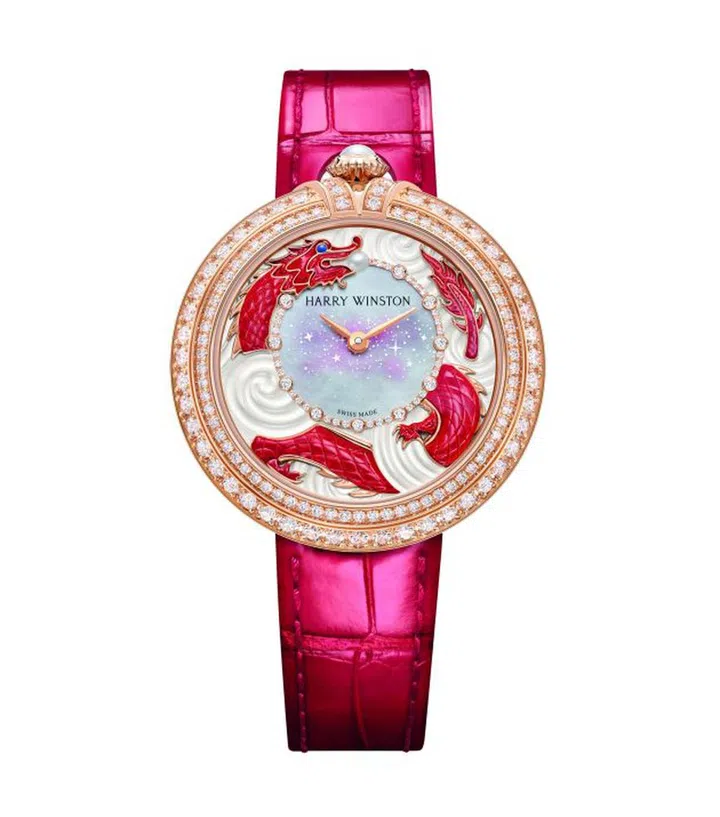 Harry Winston为龙年新创腕表系列Moments(少有品牌为了生肖表而专程开发新系列,就连Harry Winston过往的生肖表,也是基于既有系列),给人耳目一新的感觉。腕表新作选择了奢雅的玫瑰金表壳及适合女性手腕的36mm表径,并在12点位置的表冠上点缀一颗精致的珍珠。表圈上镶嵌着璀璨夺目的钻石,表盘上以白色珍珠母贝勾勒梦幻祥云,一条充满尊贵气息的红色神龙腾跃其间,代表着连绵不断的好运和幸福。
