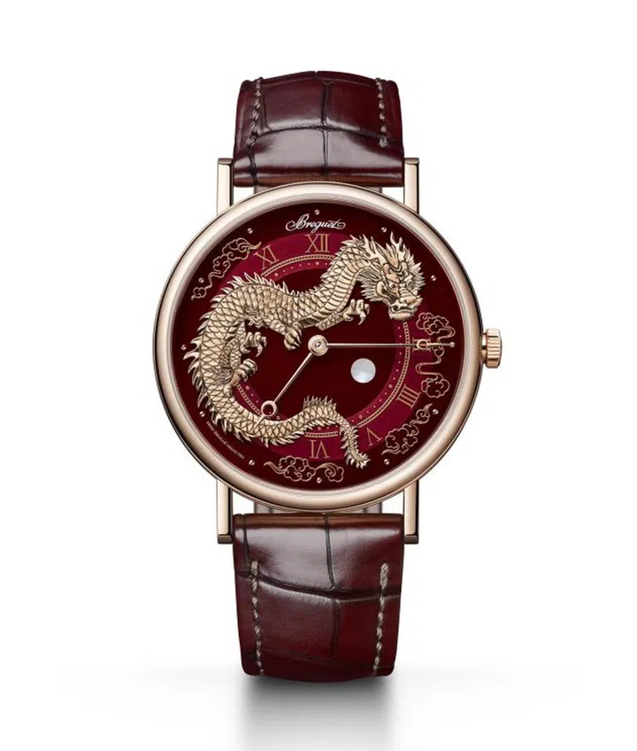 Breget为龙年推出Classique 5345双旋转陀飞轮腕表及Classique 7145两款特别腕表。其中限量8枚的Classique 7145腕表(上图)采用玫瑰金材质及深红配色,表盘在刻度圈和表盘中央之间呈现出不同的细腻色调,这种效果由珍罕工艺——“大明火”珐琅工艺制作而成。表盘上傲然不群的祥龙由纯手工雕刻而成,以威风凛凛的姿态忠实守护一颗以白色珍珠母贝制成的宝珠。其内部搭载的502.3 型机芯,厚度仅为 2.40 毫米,是品牌最纤薄的机芯之一。