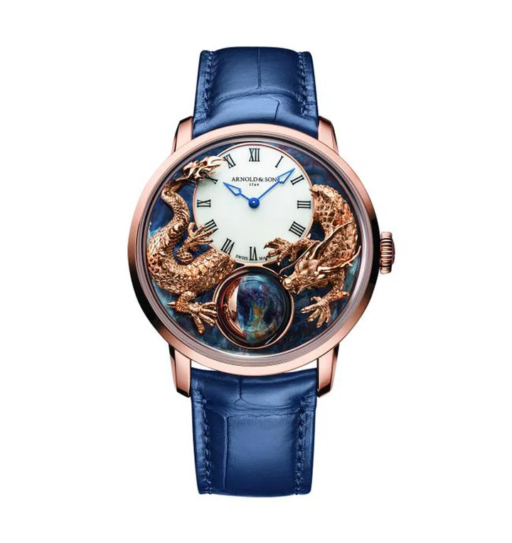 Arnold & Son Luna Magna以高级制表、微型雕塑、石雕工艺共同演绎Luna Magna Red Gold皓月红金“龙年”的两个表款。每款8枚,描绘龙月邂逅之情景(由彼得石或黑玛瑙制成的3D皓月与手工雕刻的红金神龙迎面相逢)。腕表将注意力倾注于显示腕表月相的立体地球仪,此处球体具有双重意义。它既是控制中国历法周期的月亮,也是传说中的知识明珠,与永远想要捕捉它的龙密不可分。腕表搭载由品牌表厂完全自主开发、加工、组装和调校的A&S1021机芯,该机芯以月球为核心,并忠实反应天文实况,尽显精湛娴熟的制表工艺。