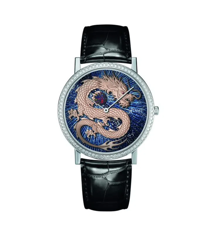 Piaget生肖腕表的特别之处,不单指一款作品也不仅聚焦于龙,而是把凤凰也纳入主题(龙和凤在传统中分别代表“阳”与“阴”男、女性特质,前者象徵权力、力量和繁荣,后者则带有希望、重生、和谐等意涵),用数款作品组呈出一个精彩纷呈的胶囊系列,包含高级腕表及珠宝。其中,一款41毫米的Altiplano至臻超薄系列高级珠宝腾龙腕表,珐琅工艺大师Anita Porchet运用内填珐琅工艺,与金雕腾龙相得益彰,呈现丝丝入扣的精致细节。腾龙以朱漆点睛,爪握玄秘的黑欧泊火球,背景刻以太阳放射状饰纹,绽放出奇光异彩。腕表搭载品牌自制的830P超薄手动上链机械机芯,限量发行8枚。