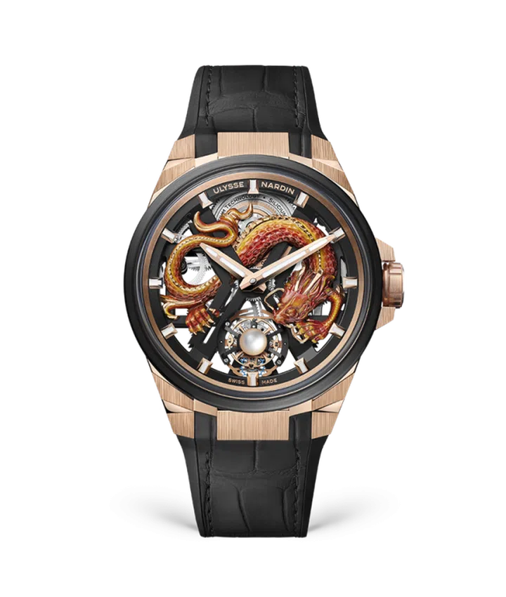 Ulysse Nardin以Blast Tourbillon腕表独特解读2024龙年,金龙戏珠纹饰精妙呈现。巨龙采用5N玫瑰金雕刻,环绕于中央“X”框架,仿佛自机芯中跃出。珍珠位于飞行陀飞轮框架上,在金龙环绕下闪烁神秘光彩。这是品牌第二次推出龙年特别腕表,前作是2012年限量88枚的鎏金系列內填珐琅金龙生肖腕表。新表搭载UN-172自制机芯,巧妙构造在镂空表盘下展现颠覆常规的精妙机械。