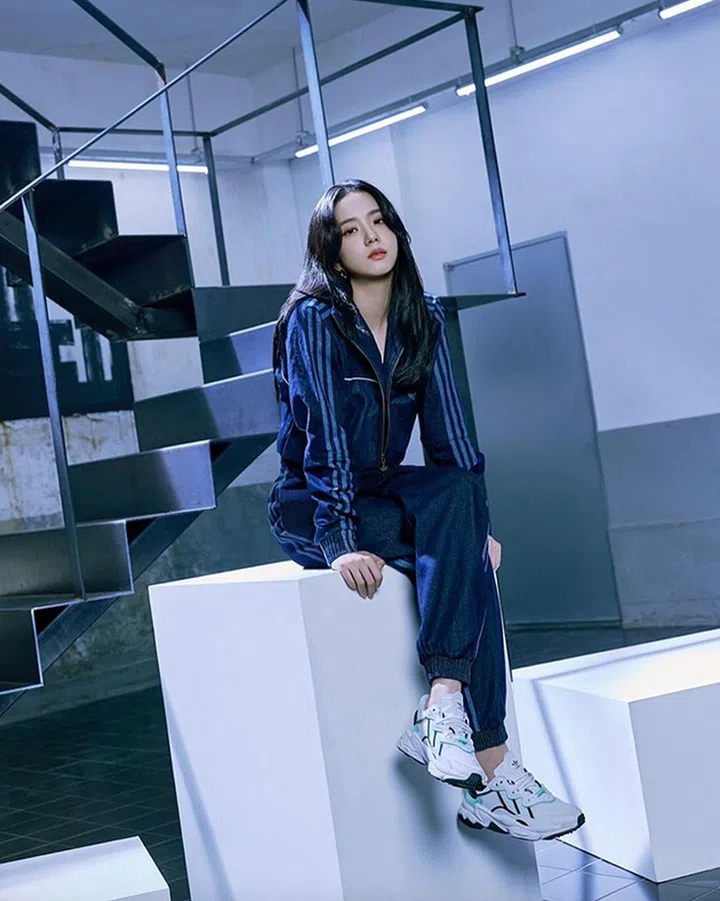 Jisoo以牛仔track jacket及track pants,搭配上Ozweego球鞋,打造出酷飒的造型,令人有种回到校园的活力感。