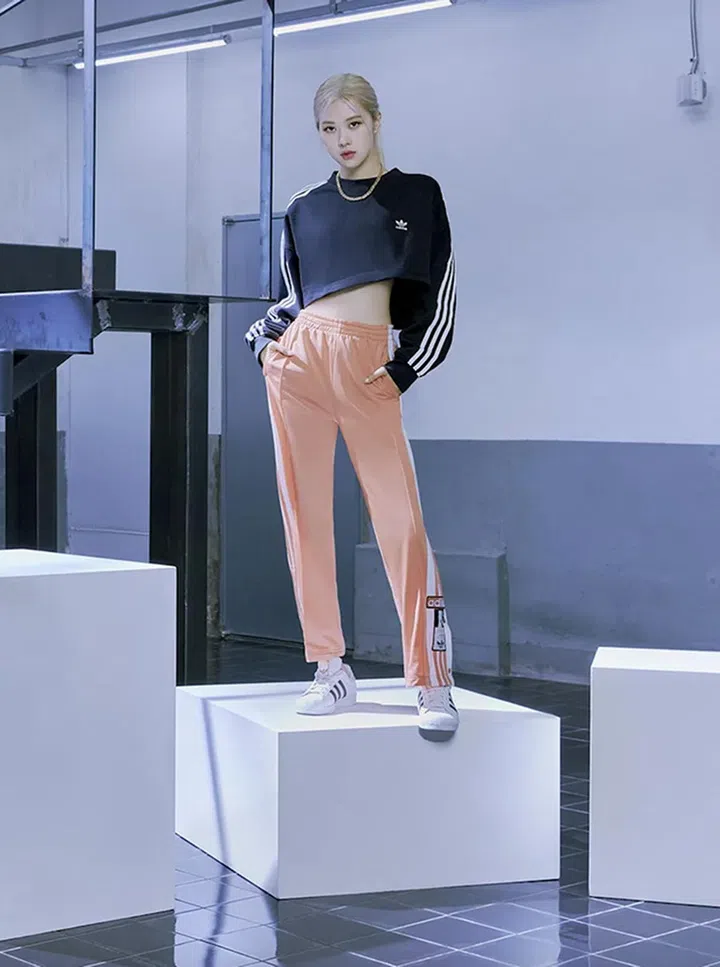 Rosé穿着短版套衫及粉色运动裤,配搭经典简约的Superstar球鞋,再戴上项链注入精致时尚感。
