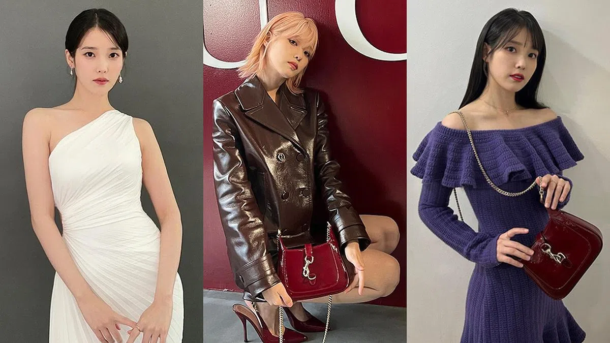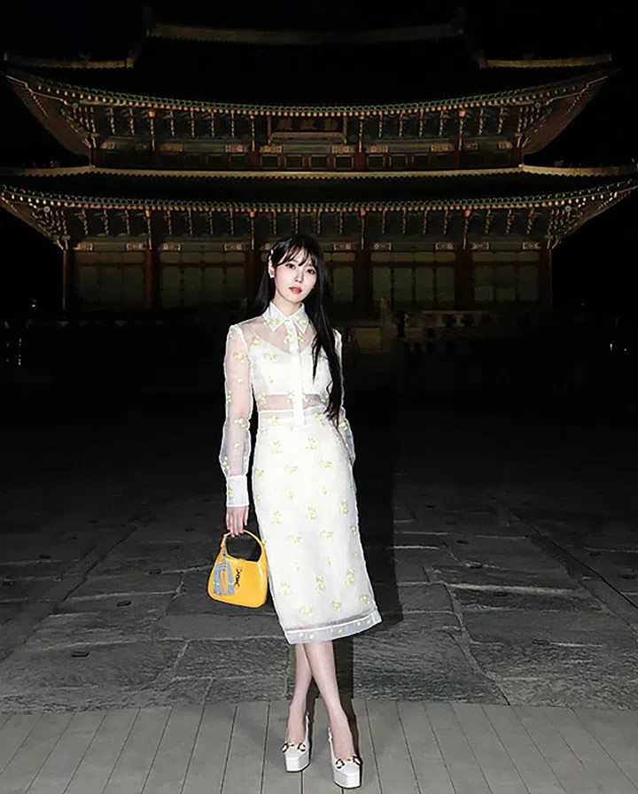 2023年,Gucci在韩国景福宫举办2024早春系列时装秀,当时IU穿着品牌2023秋冬系列服饰,搭配同色系厚底高跟鞋及黄色Jackie 1961手袋(包上还装饰有韩国传统元素),在夜色中格外清新、突出。