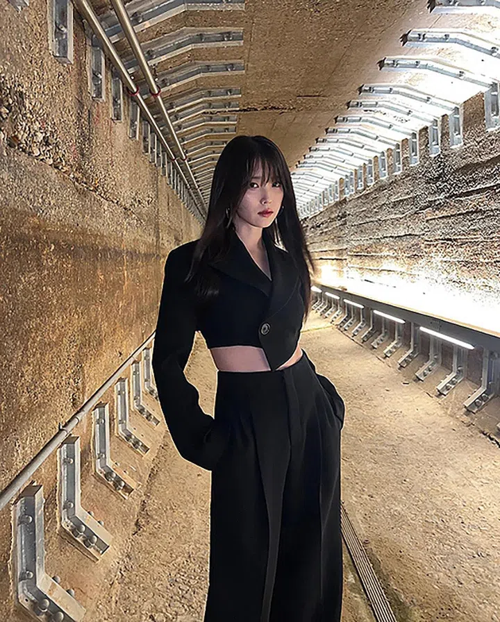 大爱IU这身茄紫色的露肩荷叶边连衣裙(来自Blumarine,Blackpink也很爱的品牌),穿起来甜美优雅又修饰身形。搭配浆果红色Gucci 1961链袋,色调浓郁又养眼。